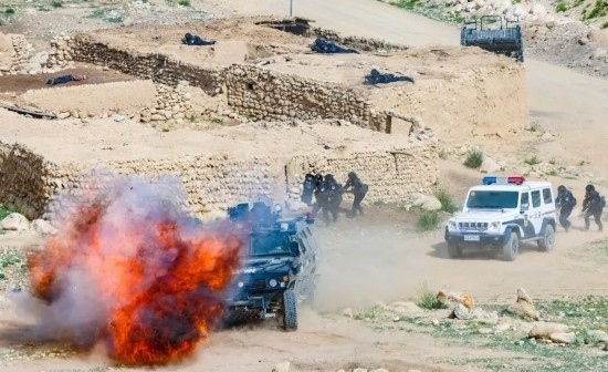 新疆邊檢總站喀什邊境管理支隊開展實戰(zhàn)模擬演練。圖為該支隊移民管理警察步甲協(xié)同,圍捕藏匿在房屋內的不法分子。