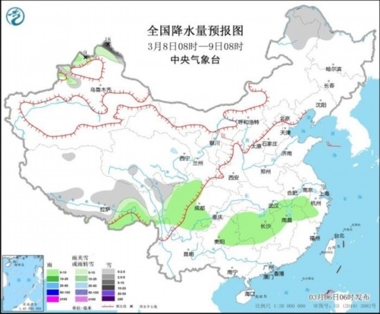 3月6日08時至7日08時,新疆西北部、西藏北部和東部、青海南部、川西高原等地部分地區(qū)有小到中雪或雨夾雪,其中,新疆西北部等地部分地區(qū)有大雪(5~7mm);新疆西北部、西藏東南部、四川南部、重慶、貴州、云南東部、湖南西北部、湖北西南部等地部分地區(qū)有小到中雨,其中,西藏東南部局地有大雨(25~30mm)。內蒙古中部、遼寧、山東半島等地部分地區(qū)有4~6級風(見圖1)。