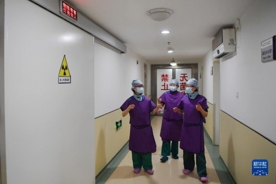 3月6日,穿上鉛衣的馬娜(左一)和同事準(zhǔn)備進(jìn)入手術(shù)室。