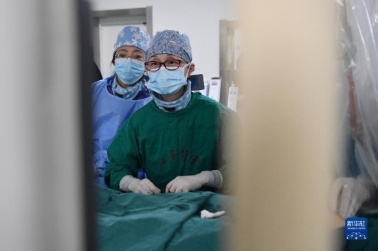 3月7日,馬娜(右)和同事在手術(shù)室為患者進(jìn)行介入手術(shù)治療。