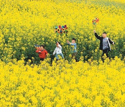 2022年,四川省眉山市仁壽縣謝安鎮(zhèn)扎林村對1200畝撂荒地集中整治,通過集體經(jīng)濟聯(lián)合社進行統(tǒng)一種植、統(tǒng)一管理,既盤活了閑置土地、讓村民變股民,又讓荒山成景點。圖為3月5日,兒童在扎林村油菜花地里玩耍。 潘 帥攝(人民視覺)