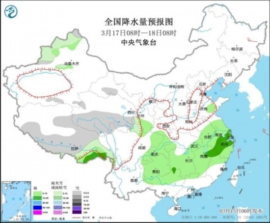 全國降水量預(yù)報(bào)圖(3月17日08時(shí)-18日08時(shí))