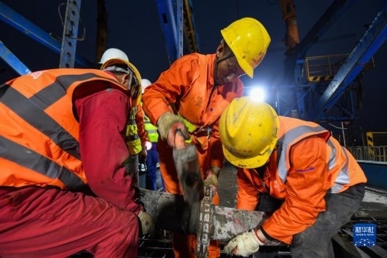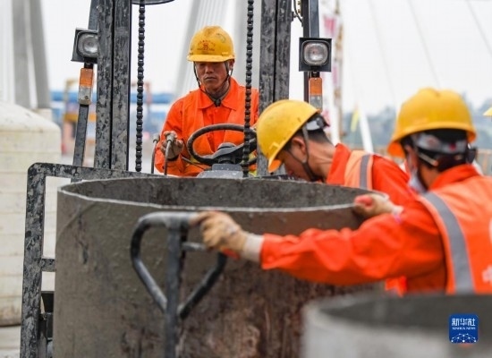3月18日,在位于四川省瀘州市的渝昆高鐵瀘州沱江特大橋主跨合龍施工現(xiàn)場,施工人員在安裝混凝土運(yùn)輸管道。