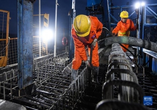 3月18日,在位于四川省瀘州市的渝昆高鐵瀘州沱江特大橋主跨合龍現(xiàn)場,施工人員在進(jìn)行混凝土澆筑。