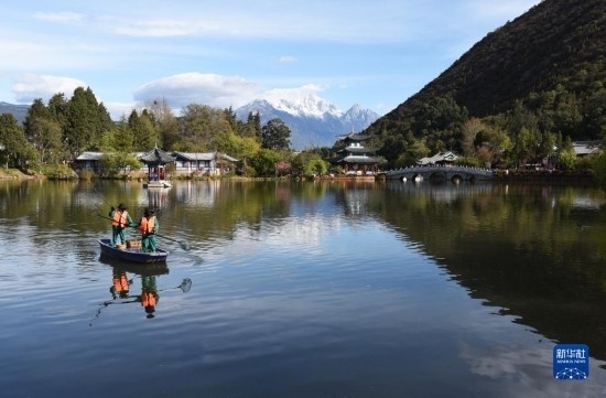 3月22日,在云南省麗江市古城區(qū)黑龍?zhí)豆珗@,環(huán)衛(wèi)工人在打撈水面垃圾。