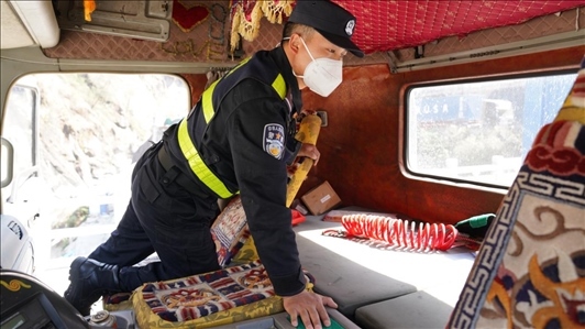 樟木口岸移民管理警察正在檢查出境車輛。人民網(wǎng)記者 唐宋攝