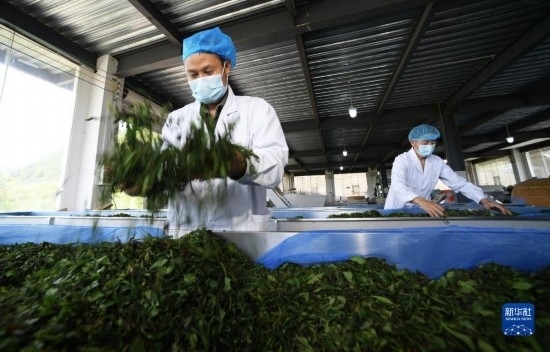 4月15日,在貴州省開陽縣南龍鄉(xiāng)翁朵村一茶葉加工廠,工人在攤晾茶青(無人機(jī)照片)。