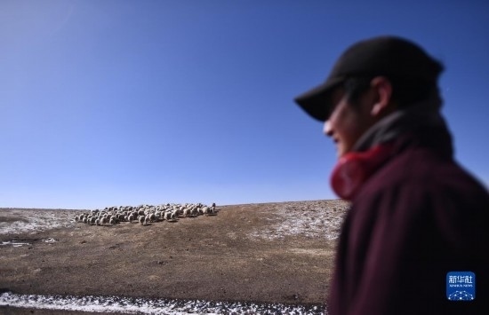 4月14日,在青海省海北藏族自治州剛察縣泉吉鄉(xiāng)寧夏村,牧民拉寶將羊群趕往草場。