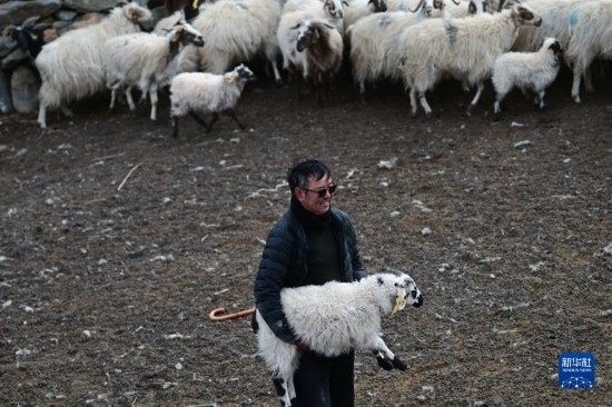 4月14日,在青海省海北藏族自治州剛察縣泉吉鄉(xiāng)寧夏村,牧民拉寶在自家羊圈中。