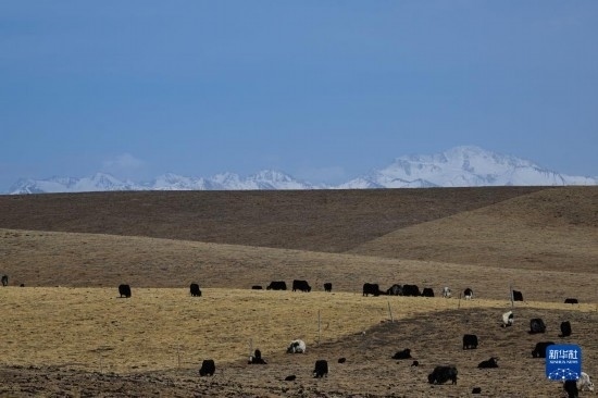 4月17日,在青海省海北藏族自治州門源回族自治縣皇城蒙古族鄉(xiāng),一群牦牛在祁連山腹地的草場上活動。