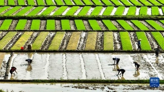 4月16日,在湖南省衡陽市祁東縣金橋鎮(zhèn),村民在搶插早稻。