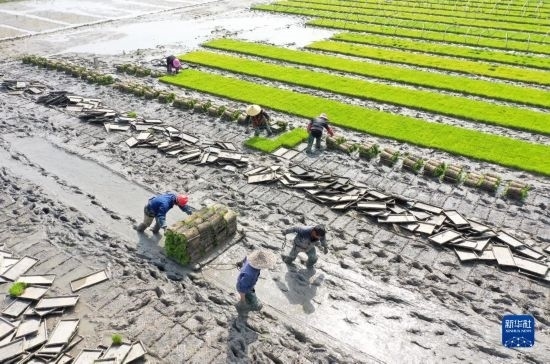 4月16日,在浙江省樂清市城東街道的一片秧田里,農(nóng)民在搬運秧苗(無人機照片)。