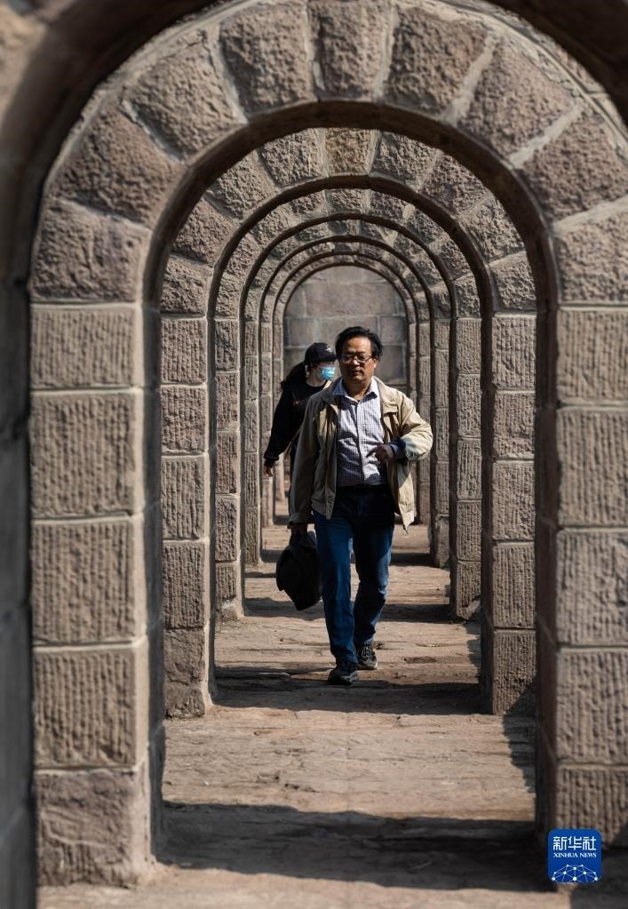 4月25日,人們?cè)跒o縣奇峰鎮(zhèn)的勝利渡槽下層行走??缭烬埾拥膭倮刹鄯稚舷聝蓪?,上層通水,下層為人行通道,非常獨(dú)特。