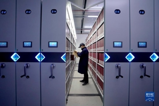 4月28日,在上海市檔案館的庫房內,保管部工作人員杜新慶在智能密集架間提取檔案。