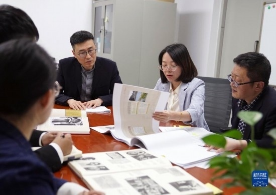 4月28日,在上海市檔案館的辦公室內,利用部工作人員方華(右二)和同事們討論策展工作的細節(jié)。