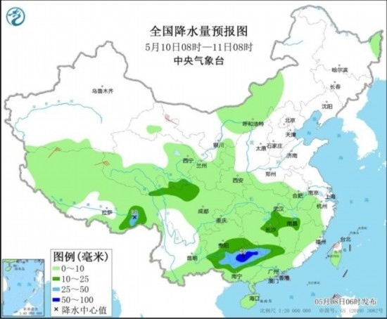 5月10日08時至11日08時,甘肅南部、青海南部、西藏北部等地部分地區(qū)有小到中雪或雨夾雪,部分地區(qū)有大到暴雪;湖南中南部、江西中北部、西南地區(qū)東南部、華南北部和西部等地部分地區(qū)有中到大雨,其中,廣西北部等地部分地區(qū)有暴雨(50~90毫米)。西藏北部和西部、甘肅河西等地部分地區(qū)有4~6級風。