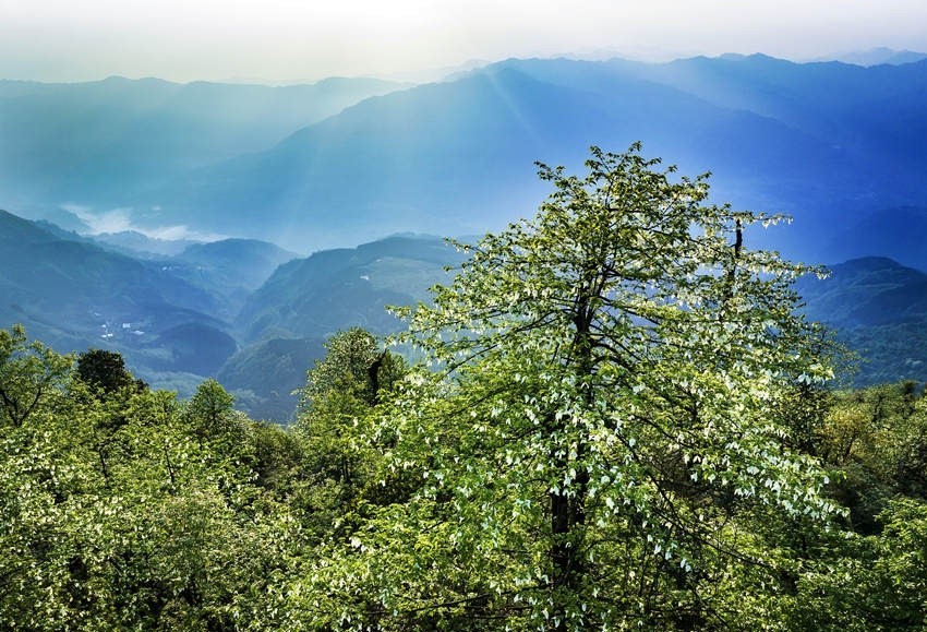 時(shí)下,正是珙桐花開的季節(jié),一朵朵珙桐花如白鴿舒展雙翅,在林中翩翩起舞,為美麗的大風(fēng)頂增添了一絲靈動。