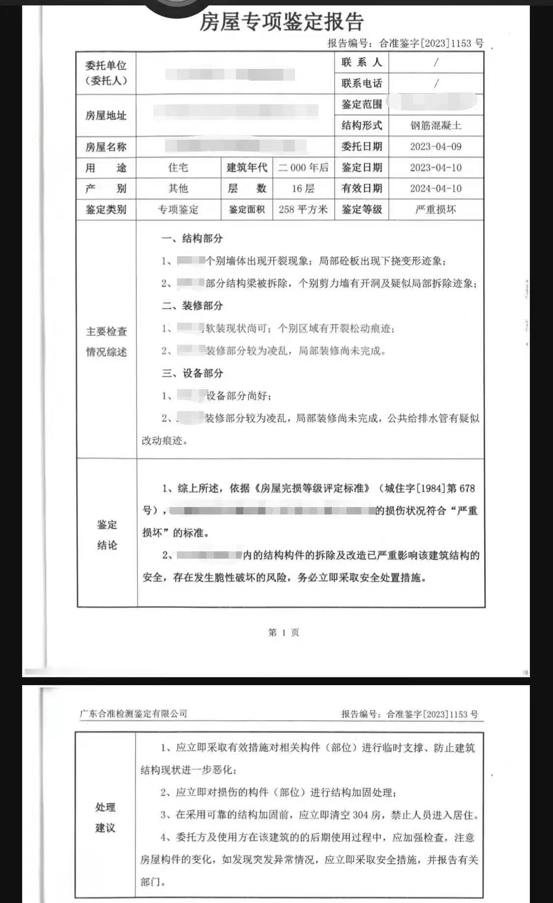 值得注意的是,發(fā)現(xiàn)204房的承重墻被拆后,有業(yè)主曾自費(fèi)請(qǐng)鑒定機(jī)構(gòu)對(duì)204房、304房進(jìn)行安全鑒定。鑒定結(jié)果顯示,涉事房屋的損傷程度符合“嚴(yán)重?fù)p壞”的標(biāo)準(zhǔn);在采用可靠的結(jié)構(gòu)加固前,應(yīng)立即清空304房,禁止人員進(jìn)入居住。而在5月5日,永平街道辦在涉事樓棟貼出“致廣大居民朋友的一封信”,其中提到:4月8日至18日,已經(jīng)完成了臨時(shí)加固支撐工程,目前建筑物整體結(jié)構(gòu)穩(wěn)定可控,人員無(wú)需轉(zhuǎn)移,但需要盡快加固補(bǔ)強(qiáng)。