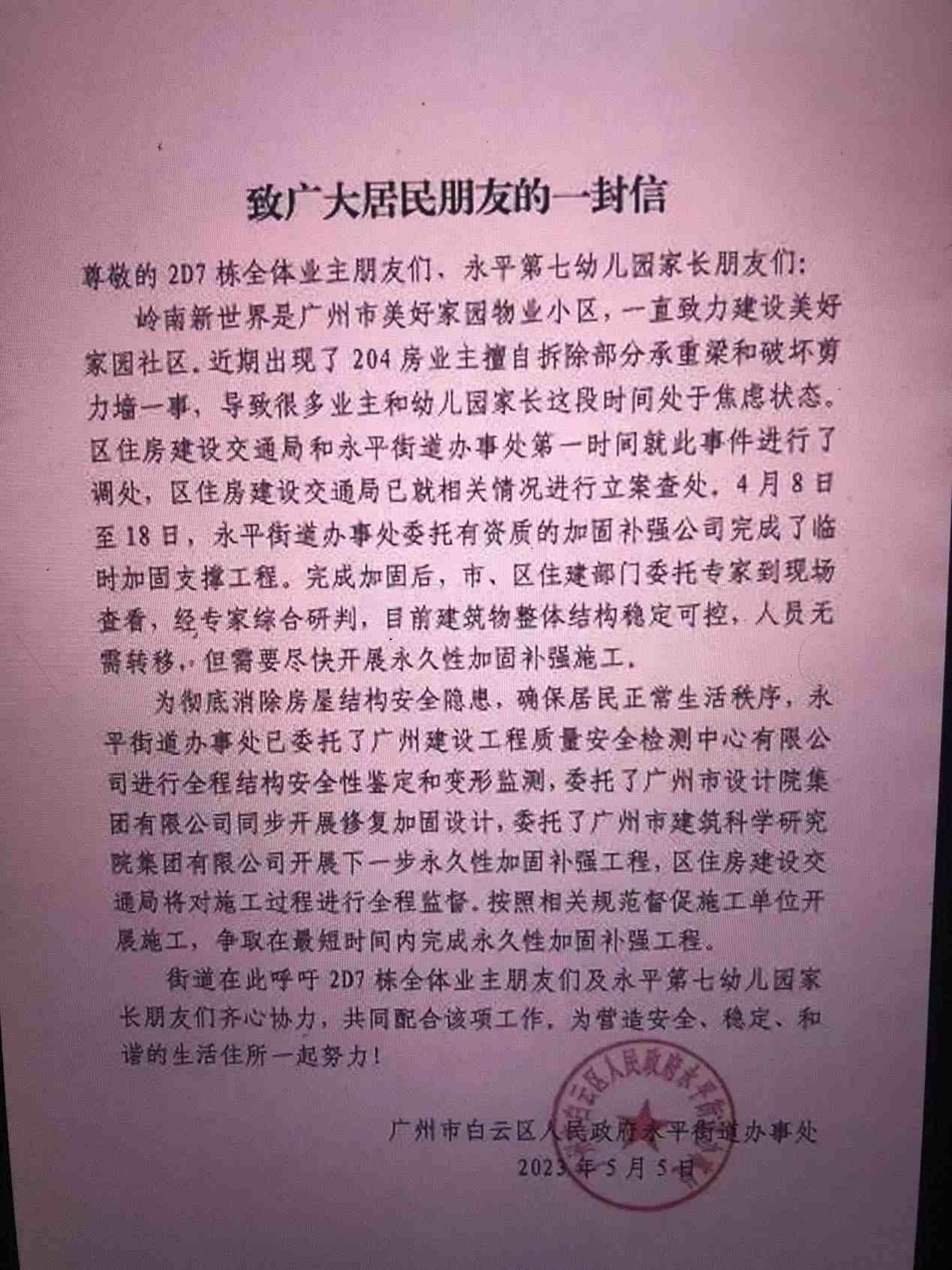 ·“廣州一租戶(hù)私拆承重墻”追蹤:已臨時(shí)加固,業(yè)主擬聯(lián)合起訴。