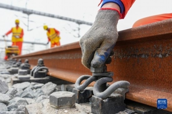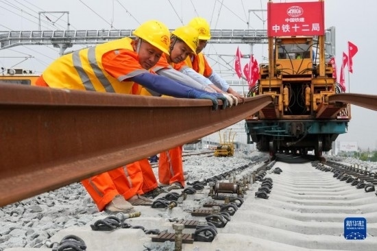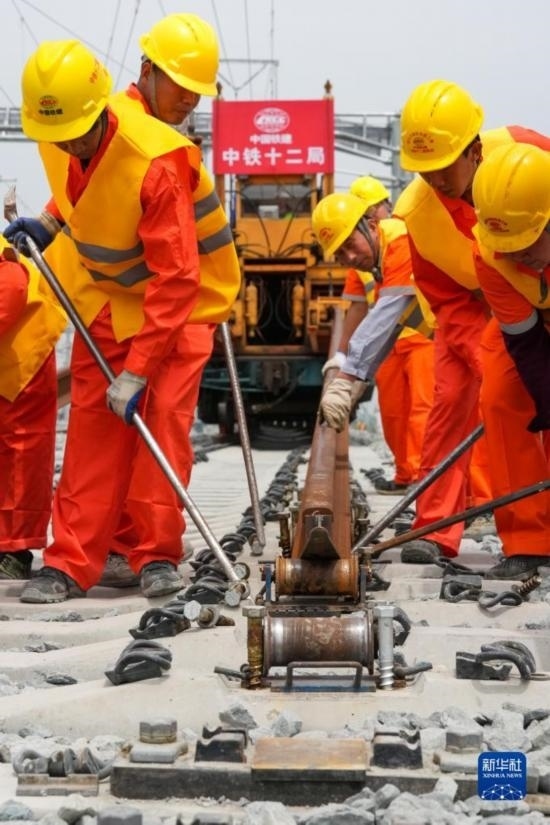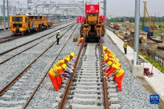 5月20日,在滬寧沿江高鐵太倉站施工現(xiàn)場,中鐵十二局的工程人員準備進行螺栓緊固作業(yè),將對接好的鋼軌固定。