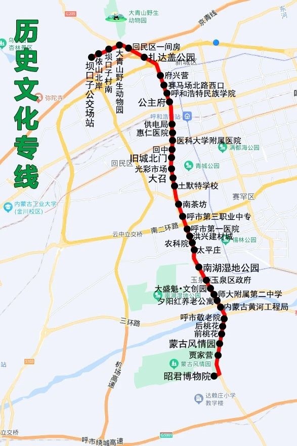 沿途設(shè)站:壩口子公交場站、依山北岸、壩口子村南、大青山野生動物園、回民區(qū)一間房、扎達蓋公園、府興營、賽馬場北路西口、呼和浩特民族學院、公主府、供電局、匯仁醫(yī)院、醫(yī)科大學附屬醫(yī)院、回中、舊城北門、光彩市場、大召、土默特學校、南茶坊、呼市第三職業(yè)中學、呼市第一醫(yī)院、洪興建材城、農(nóng)科院、太平莊、南湖濕地公園、玉泉區(qū)政府、大盛魁文創(chuàng)園、師大附屬第二中學、夕陽紅養(yǎng)老公寓、內(nèi)蒙古黃河工程局、呼市敬老院、后桃花、前桃花、蒙古風情園、賈家營、昭君博物院。