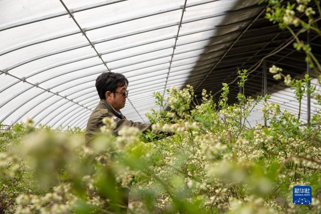 5月20日,在黑龍江伊藍(lán)生物科技有限公司藍(lán)莓藍(lán)靛果種植示范基地,工人在整理藍(lán)莓枝。