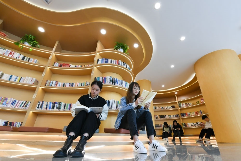市民在江蘇省張家港市沙洲湖益空間·源書房內(nèi)閱讀(2023年4月21日攝)。新華社記者 李博 攝