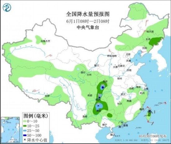 6月1日08時至2日08時,吉林東部、西北地區(qū)東南部、西南地區(qū)東部等地部分地區(qū)有中到大雨,其中,臺灣島北部、四川東北部等地部分地區(qū)有暴雨(50~95毫米)。內(nèi)蒙古、東北地區(qū)、浙江、福建沿海、臺灣島等地部分地區(qū)有4~6級風。東海南部、臺灣以東洋面將有7~8級風,陣風9級。