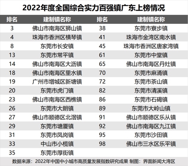 中國中小城市發(fā)展指數(shù)研究課題組、國信中小城市指數(shù)研究院去年發(fā)布的《2022年中國中小城市高質(zhì)量發(fā)展指數(shù)研究成果》顯示,在全國百強鎮(zhèn)名單中,廣東共有29個鎮(zhèn)上榜。其中,東莞虎門鎮(zhèn)位列全國第20名。