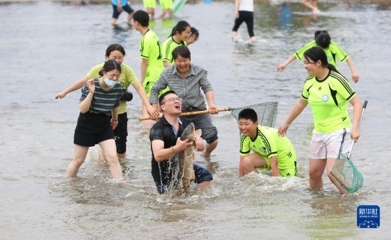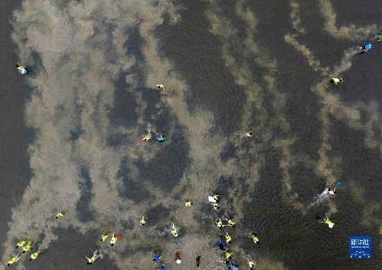 5月30日,在淮安市洪澤區(qū)岔河鎮(zhèn),人們?cè)诓逖砉?jié)上參加摸魚(yú)比賽(無(wú)人機(jī)照片)。