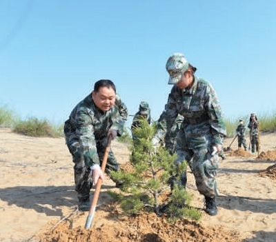 行進10分鐘,終于到達了植樹點。女民兵們有序分工,挖土、扶苗、填土、澆水……每道工序做得一絲不茍?,F(xiàn)場負責指揮的鄭宏利是治沙連副政治指導員,今年31歲,已經(jīng)在連隊工作了8年。她經(jīng)驗豐富,一邊指揮,一邊向大家講解植樹技巧,“挖坑要根據(jù)樹苗土球的大小來挖,種的時候要把土球外的塑料包裝給去掉,確保種一棵活一棵?!?/p>