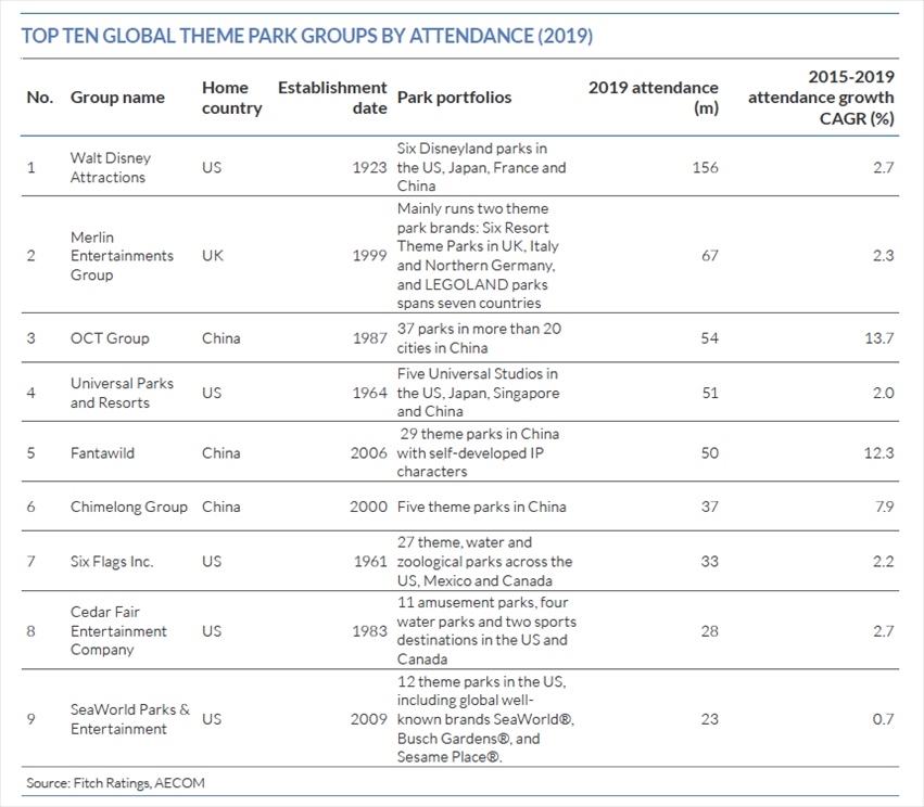 惠譽評級發(fā)布的主題公園藍皮書也顯示,從2019年全球各大主題公園集團旗下樂園的游客量來看,歡樂谷的母公司華僑城集團位列第3,旗下主題公園2019年的游客量約5400萬人次;華強方特位列第5,旗下主題公園2019年的游客量約5000萬人次;長隆集團位列第6,旗下主題公園2019年的游客量約3700萬人次。