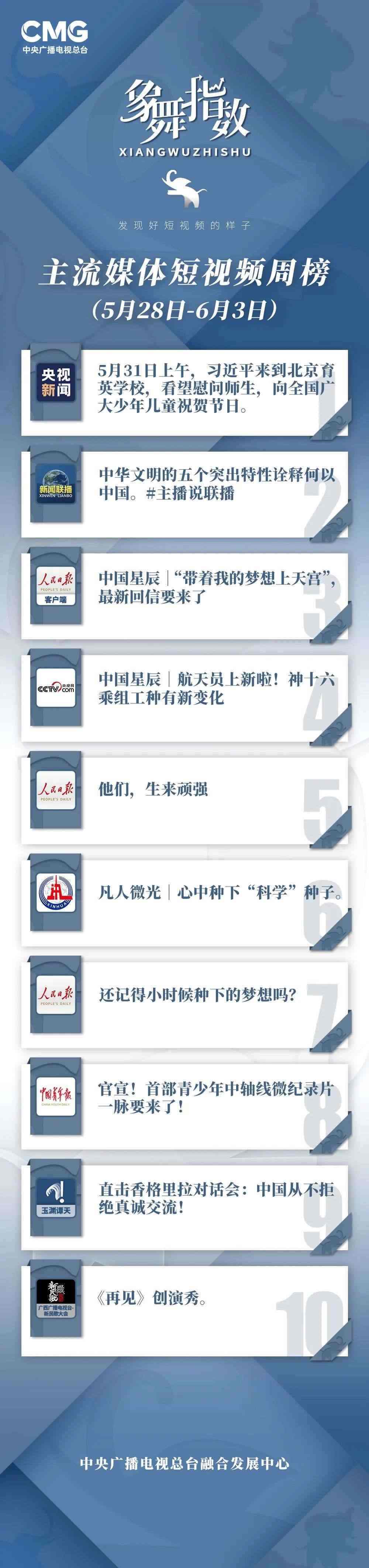 中央廣播電視總臺“象舞指數(shù)”評議品牌,推出主流媒體短視頻周榜、總臺短視頻周榜。在2023年5月28日—6月3日,這些內(nèi)容引發(fā)大眾關注: