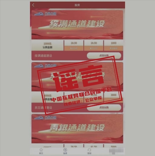 真相:近期,中國國家鐵路集團有限公司接到群眾來電咨詢,反映一款名為“八縱八橫”APP程序自稱是國鐵集團授權(quán)推出的理財產(chǎn)品,設(shè)有“呼南通道建設(shè)”“沿海通道建設(shè)”“京蘭通道建設(shè)”等9款投資理財項目,并將國鐵集團公司簡介、新聞報道等內(nèi)容在APP中用于宣傳推廣。對此,國鐵集團發(fā)布嚴(yán)正聲明稱,國鐵集團及所屬單位從未授權(quán)或利用其他網(wǎng)站、APP、微信公眾號、微博等形式以“國鐵集團”或“中國鐵路”的名義銷售投資理財產(chǎn)品,也沒有通過這樣的方式籌集鐵路建設(shè)資金。不法分子利用“八縱八橫”APP程序所實施的行為和發(fā)布的內(nèi)容已涉嫌詐騙,請公眾提高警惕,謹慎區(qū)分,注意防騙。如已被騙,請立即向公安機關(guān)報案。(來源:“中國鐵路”微信公眾號)