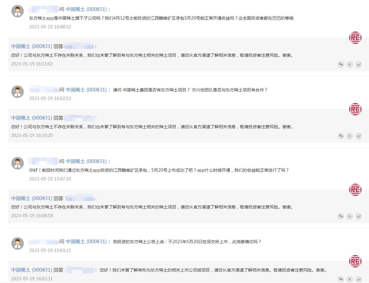 中新財經(jīng)注意到,有投資者曾在互動平臺上向中國稀土詢問“東方稀土”相關信息,從提問內(nèi)容看,可能已有投資者被誤導受騙。比如,“東方稀土APP是中國稀土旗下子公司嗎?我們4月12號之前投資的江西贛南礦區(qū)承包5月20號能正常開通收益嗎?”“我投資的東方稀土公告上說:于2023年5月20曰在深交所上市,此消息確切嗎?”等等。