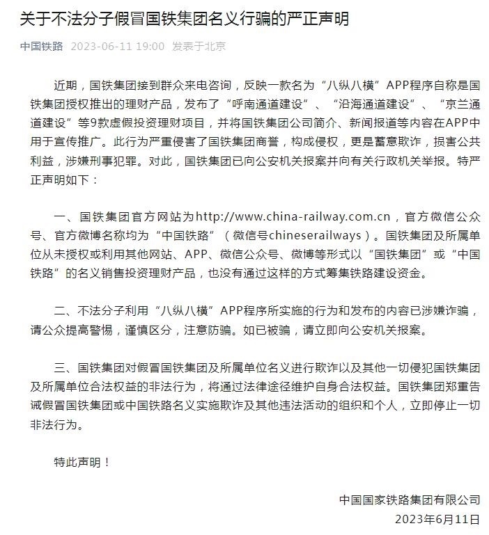 “中國鐵路”微信公眾號6月11日發(fā)布嚴正聲明稱,近期,國鐵集團接到群眾來電咨詢,反映一款名為“八縱八橫”APP程序自稱是國鐵集團授權推出的理財產(chǎn)品,發(fā)布了“呼南通道建設”、“沿海通道建設”、“京蘭通道建設”等9款虛假投資理財項目,并將國鐵集團公司簡介、新聞報道等內(nèi)容在APP中用于宣傳推廣。