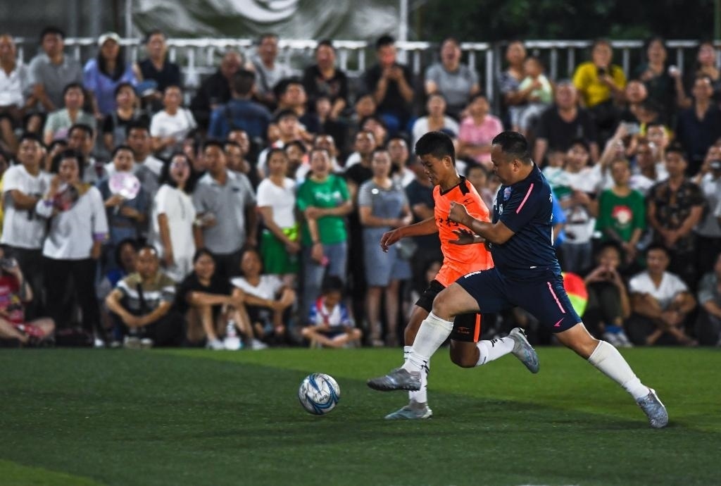 6月9日,新中村足球隊球員(左)與鳳凰村足球隊球員在比賽中拼搶。新華社記者 楊文斌 攝