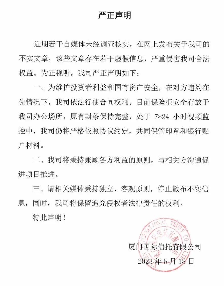 5月18日,廈門信托在官網(wǎng)和官方微信公眾號發(fā)布嚴正聲明稱,為維護投資者利益和國有資產安全,在對方違約在先情況下,我司依法行使合同權利。目前保險柜安全存放于我司辦公場所,原有封條保持完整,處于7*24小時視頻監(jiān)控中,我司仍將嚴格依照協(xié)議約定,共同保管印章和銀行賬戶材料。此外,我司將秉持兼顧各方利益的原則,與相關方溝通促進項目推進。
