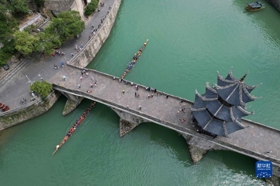 6月17日,游客在鎮(zhèn)遠(yuǎn)古城 陽河畔體驗(yàn)劃龍舟(無人機(jī)照片)。