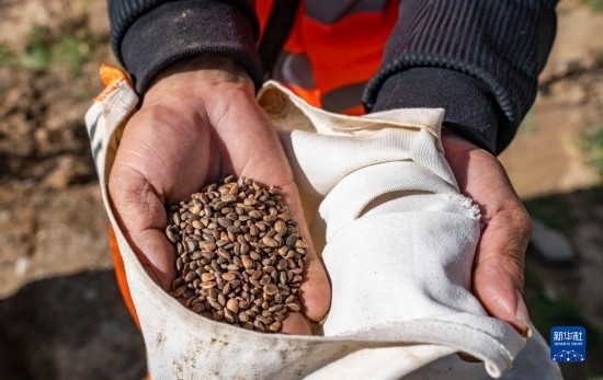 工人展示待播撒的油松種子(6月18日攝)。