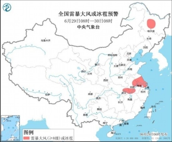 中央氣象臺(tái)6月29日06時(shí)繼續(xù)發(fā)布暴雨藍(lán)色預(yù)警和強(qiáng)對(duì)流天氣黃色預(yù)警:預(yù)計(jì),6月29日08時(shí)至30日08時(shí),黃淮南部、江淮、江漢中南部、江南北部、重慶東部以及黑龍江北部、內(nèi)蒙古東北部等地部分地區(qū)有大到暴雨,其中,湖北東部等地局地有大暴雨(100~150毫米)。上述部分地區(qū)伴有短時(shí)強(qiáng)降水(最大小時(shí)降雨量30~50毫米,局地可超過70毫米),黑龍江中部、安徽中南部、江蘇中南部、上海西北部、湖北東部等地的部分地區(qū)將有8~10級(jí)雷暴大風(fēng)或冰雹天氣,局地風(fēng)力11級(jí),江蘇中南部局地可能伴有龍卷(見圖1和圖2)。強(qiáng)對(duì)流的主要影響時(shí)段為今天午后至夜間。