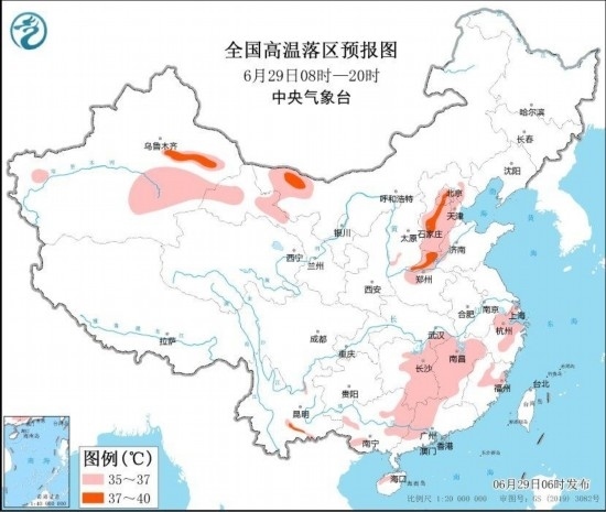 圖3 全國高溫落區(qū)預(yù)報(bào)圖(6月29日08時(shí)-20時(shí)) 圖自中央氣象臺(tái)網(wǎng)站