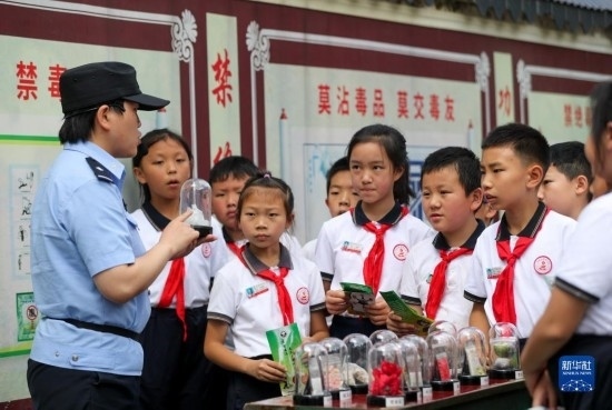 6月25日,民警在貴州省安順市禁毒宣傳教育基地為學生講解毒品相關知識。
