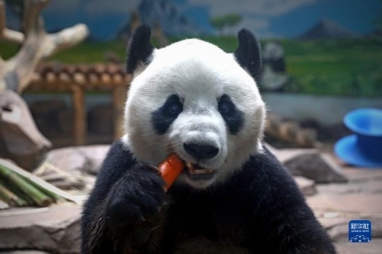 6月26日,“剛剛”在鞍山動物園熊貓館里吃胡蘿卜。