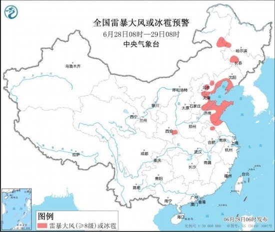 預(yù)計(jì),6月28日08時(shí)至29日08時(shí),遼東半島、北京東部、天津北部、河北東北部、山東中東部、四川東部、陜西南部、重慶大部、湖北西部等地部分地區(qū)有大到暴雨,其中,重慶北部局地有大暴雨(100~140毫米)。上述部分地區(qū)伴有短時(shí)強(qiáng)降水(最大小時(shí)降雨量30~50毫米,局地可超過(guò)60毫米),內(nèi)蒙古東北部、黑龍江西南部、吉林中西部、遼寧南部、陜西東南部、河北東部、北京東部、天津、山東北部和東部、安徽北部、江蘇北部等地的部分地區(qū)將有8~10級(jí)雷暴大風(fēng)或冰雹天氣,局地風(fēng)力可達(dá)11級(jí)(見(jiàn)圖1和圖2)。中央氣象臺(tái)6月28日06時(shí)繼續(xù)發(fā)布暴雨藍(lán)色預(yù)警和強(qiáng)對(duì)流天氣藍(lán)色預(yù)警。