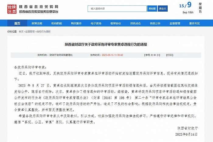 ·一名政府采購評審專家被舉報(bào)泄露評審信息,陜西省財(cái)政廳通報(bào)。