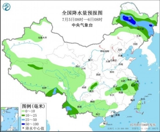 全國降水量預報圖(7月4日08時-5日08時)。圖片來源:中央氣象臺網站