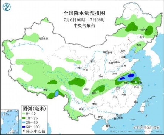 全國降水量預報圖(7月6日08時-7日08時)。圖片來源:中央氣象臺網站