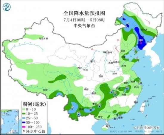 7月4日08時至5日08時,7月4日08時至5日08時,內蒙古東北部、黑龍江西南部、吉林、遼寧中東部、云南西部和南部等地部分地區(qū)有大到暴雨,其中,遼寧東北部等地局地有大暴雨(100~120毫米)。內蒙古、黑龍江、遼寧、河北北部、山東半島等地部分地區(qū)有4~6級風。