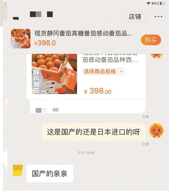 隨后,記者隨機(jī)在電商平臺(tái)選擇三款標(biāo)明是“進(jìn)口水果”的產(chǎn)品進(jìn)行詢問,結(jié)果對(duì)方均表示自己的水果是“國產(chǎn)的”。當(dāng)記者詢問一電商客服,標(biāo)價(jià)398元兩斤的“現(xiàn)貨靜岡番茄”和標(biāo)價(jià)178元一斤的日本淡雪白草莓是哪里產(chǎn)的時(shí),對(duì)方回答“親親,國產(chǎn)的”。